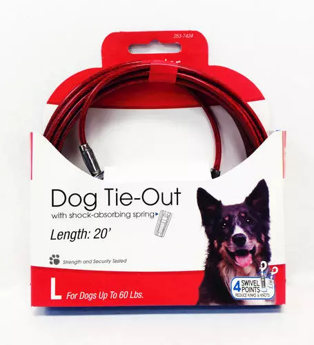 This Master Paws 20-foot tie-out is for large dogs up to 60 pounds. It features patented twin swivel snaps and a patented comfort snap spring.