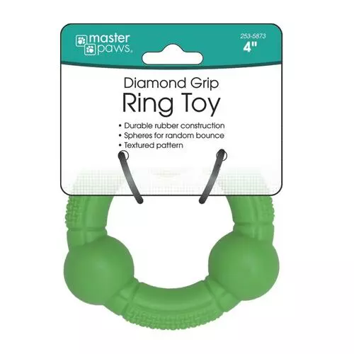 This tough ring is great for your pooch to chew on or for fetch. Cool diamond grip. Great for small and medium dogs.