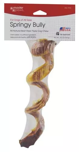 This treat is a USA beef steer pizzel curled into a fun shape. It’s all natural with a great taste for your dog.